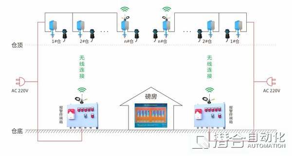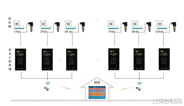 上料口側(cè):上料安全控制終端、電動(dòng)蝶閥,每個(gè)料倉(cāng)1個(gè),各個(gè)終端通過(guò)網(wǎng)絡(luò)連接。